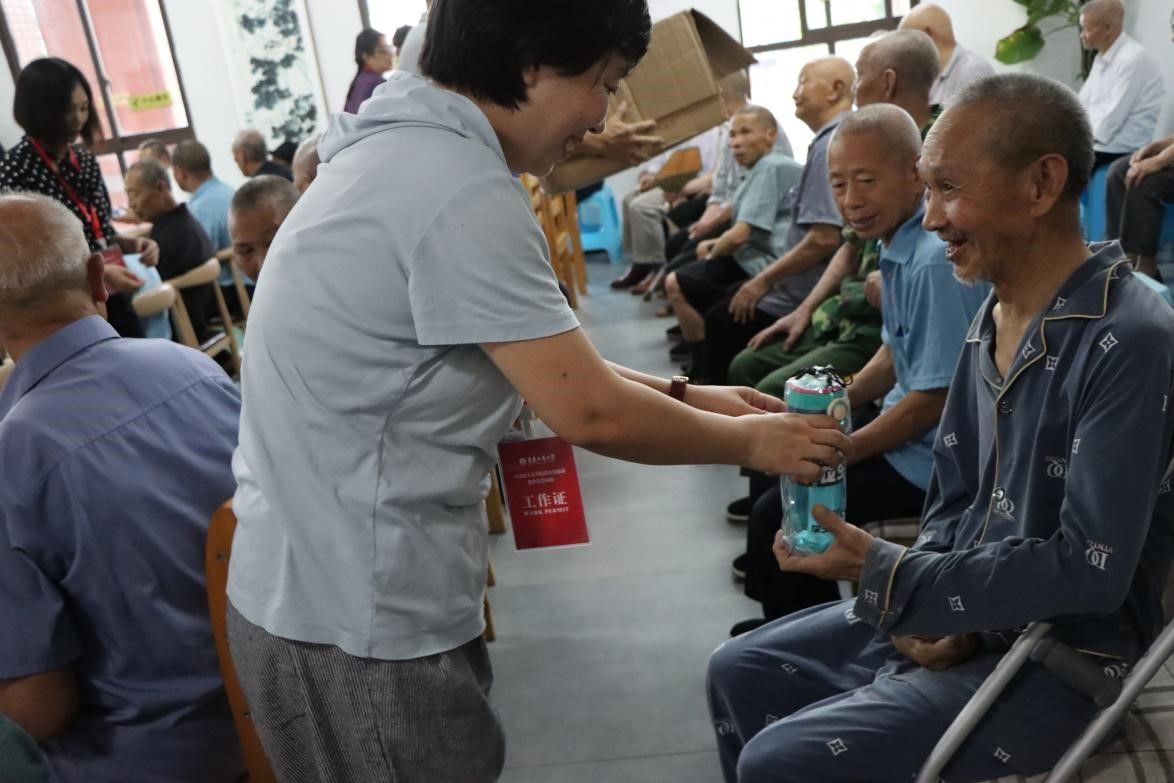 实践团成员为爷爷奶奶们带来军体拳、跳舞、诗歌朗诵等精彩节目,这些节目表演充满了对爷爷奶奶们的真诚祝福、带去了心灵的慰藉,整个敬老院洋溢着温馨、祥和的气氛。其中有位91岁的高龄老人为了欢迎实践团的到来,表演了一段打连响,老人的精神活力令实践团成员纷纷赞叹。随后,实践团将带来的小礼物(水杯)分发给每位老人,希望老人们能够在炎炎夏日保持身体健康。