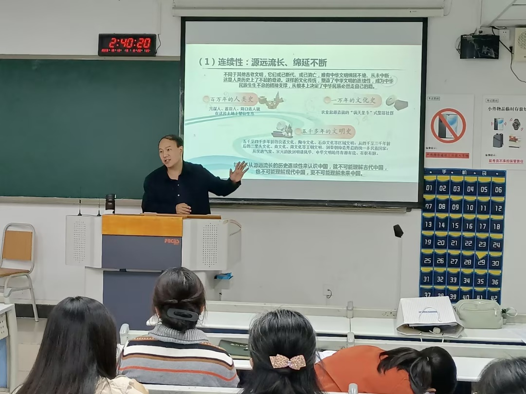 本次备课会的主要内容是本期形势与政策课第三讲——《赓续历史文脉,谱写当代华章》。黄伟教授从形势与政策的教学目标出发,向与会老师强调了形势与政策课肩负的培养大学生的使命担当,所有的教学内容都应为这个目标服务。形势政策课要讲得让学生信服,授课教师要做到真懂真信。他介绍了本讲内容的时代背景、教学重点、和教学难点,讲解了中华文明的突出特性和文化传承的重要意义。黄教授的讲授生动精彩、风趣幽默,赢得了现场的热烈掌声。